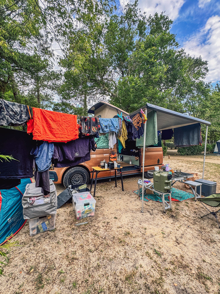 We brought a compact retractable washing line that we could tie up at various campsites. It was one of our most-used items — five towels and countless clothes meant there was always something to hang out. We also noticed that seasoned campers brought foldaway rotary lines, which are brilliant if you’ve got the storage space.
